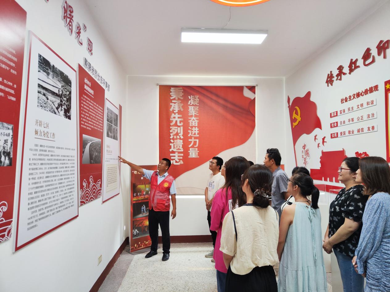曙光社区红色文化传习所内,在志愿者的引导下,大家认真观看各个板块,通过一张张照片、一段段文字,认真了解戴曙光烈士生平事迹。