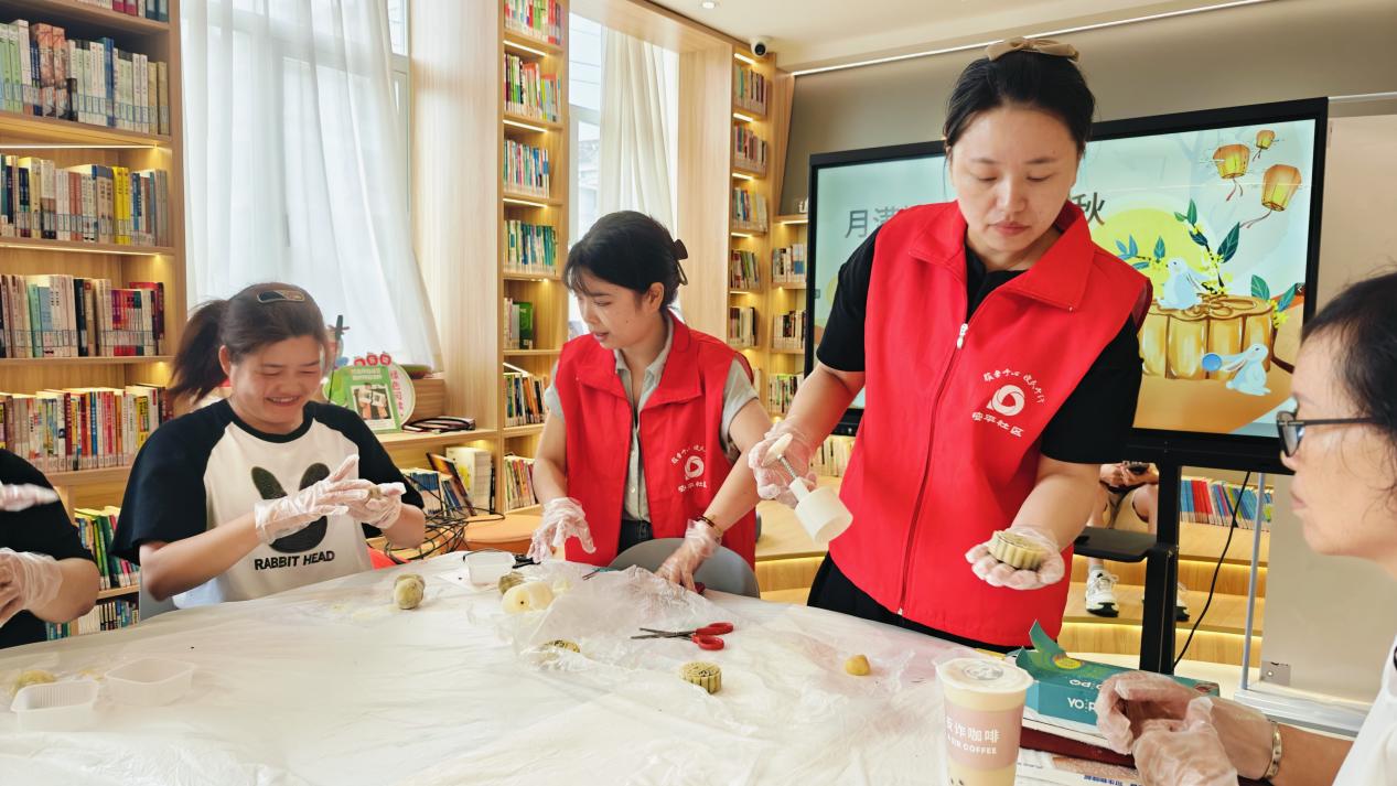 期间,工作人员早早地将制作月饼的面粉、馅料、擀面杖等原材料和工具准备妥当。大家围坐在桌旁,工作人员为每位居民分发了饼皮、馅料、月饼模具等所需的材料,大家一起揉皮、加馅料、包月饼、放入模具按压三五下成形,经过近一个小时的制作,一个个白白的面饼完成了,做成的数百个品相完好的面饼第一批被送入电饼铛烤制。烘焙过程中,不时地飘出阵阵香味儿,引得大家口水直流。居民们欢声笑语,拿着烤好的月饼互相展示,拍照留念,互相祝福中秋快乐,现场一片热闹愉悦的温馨氛围。