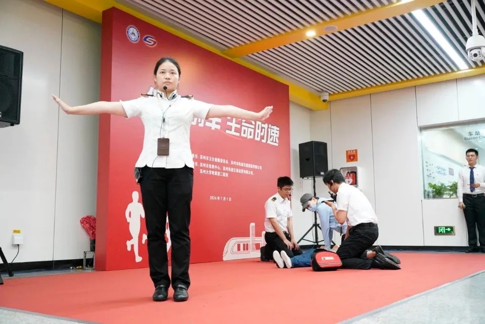 苏州市急救中心还同步对轨交站内工作人员进行急救知识和技能培训。截至8月底,苏州轨交共计超过10,000名员工参与了培训。