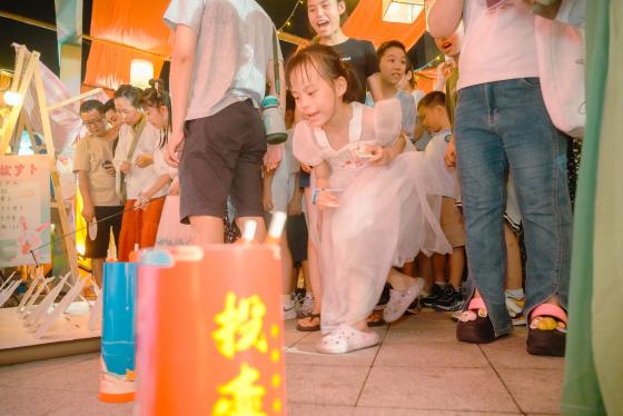 舞台之下,趣味集章游戏和文化体验摊位正紧锣密鼓地进行着。游戏区域,只见有的孩子张弓搭箭,眼神犀利,坚定无比地要把“十个金乌”射下;有的孩子把蹴鞠玩成了“投篮”,还不小心把球传给了“守门员”志愿者,引得现场哈哈大笑;猜灯谜区域,有小朋友急忙捂住将谜底呼之欲出的家长,又急又气的样子十分可爱;还有投壶、拔萝卜等妙趣横生的小游戏,居民们乐此不疲地穿梭于各个摊位间。