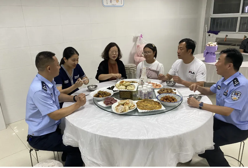 原来,他的妻子女儿在食堂里等着他,他们要与人民卫士们共同度过这个特别的中秋。这一刻,食堂变成了温馨的团聚地,笑语欢声此起彼伏。