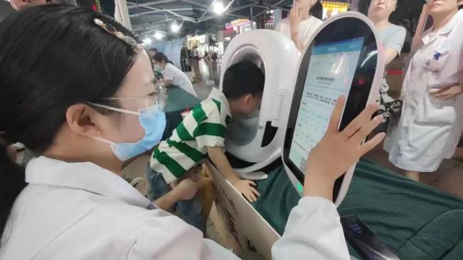 中医体质辨识区引起了许多市民的好奇,大家争相体验科技与传统中医结合的新鲜事物,当仪器镜头捕捉到舌苔的形态和颜色后,只需几分钟就能得知自己的体质,同时获得一份科学的饮食建议。