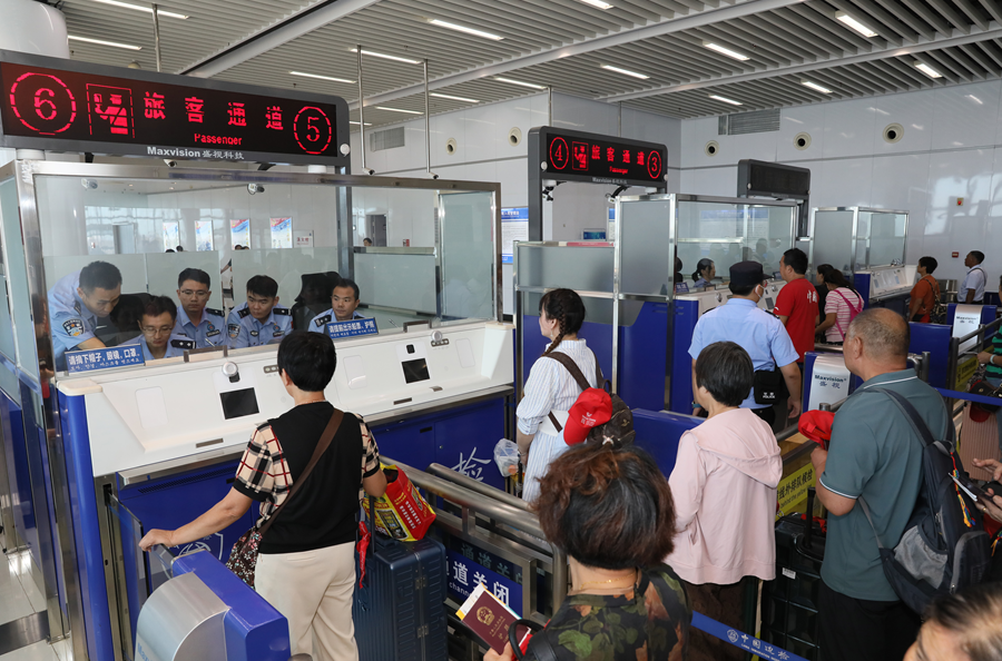 9月19日,连云港港国际客运站出境大厅人头攒动,来自上海、湖北等地的900余名旅客在边检民警的引导下有序通关过检,登上“和谐云港”轮开启7天6晚的韩国之行。