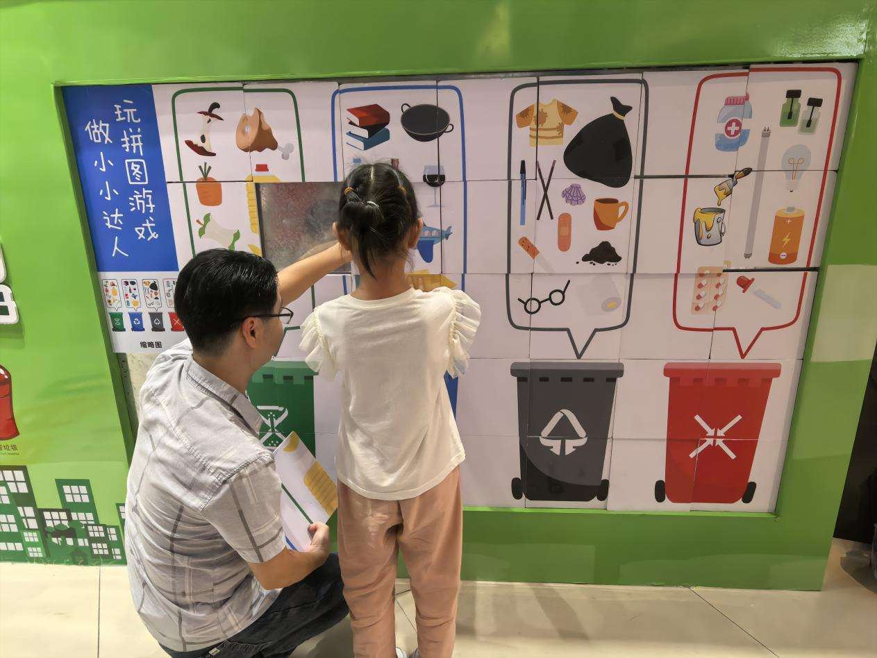 同时,龙湖六合天街在该商场一楼设置了垃圾分类互动体验区,不仅提供了“垃圾分类猜猜猜”、飞行棋、趣味拼图等互动小游戏,同时还展示了部分学生手绘的垃圾分类主题绘画、手工艺作品等。