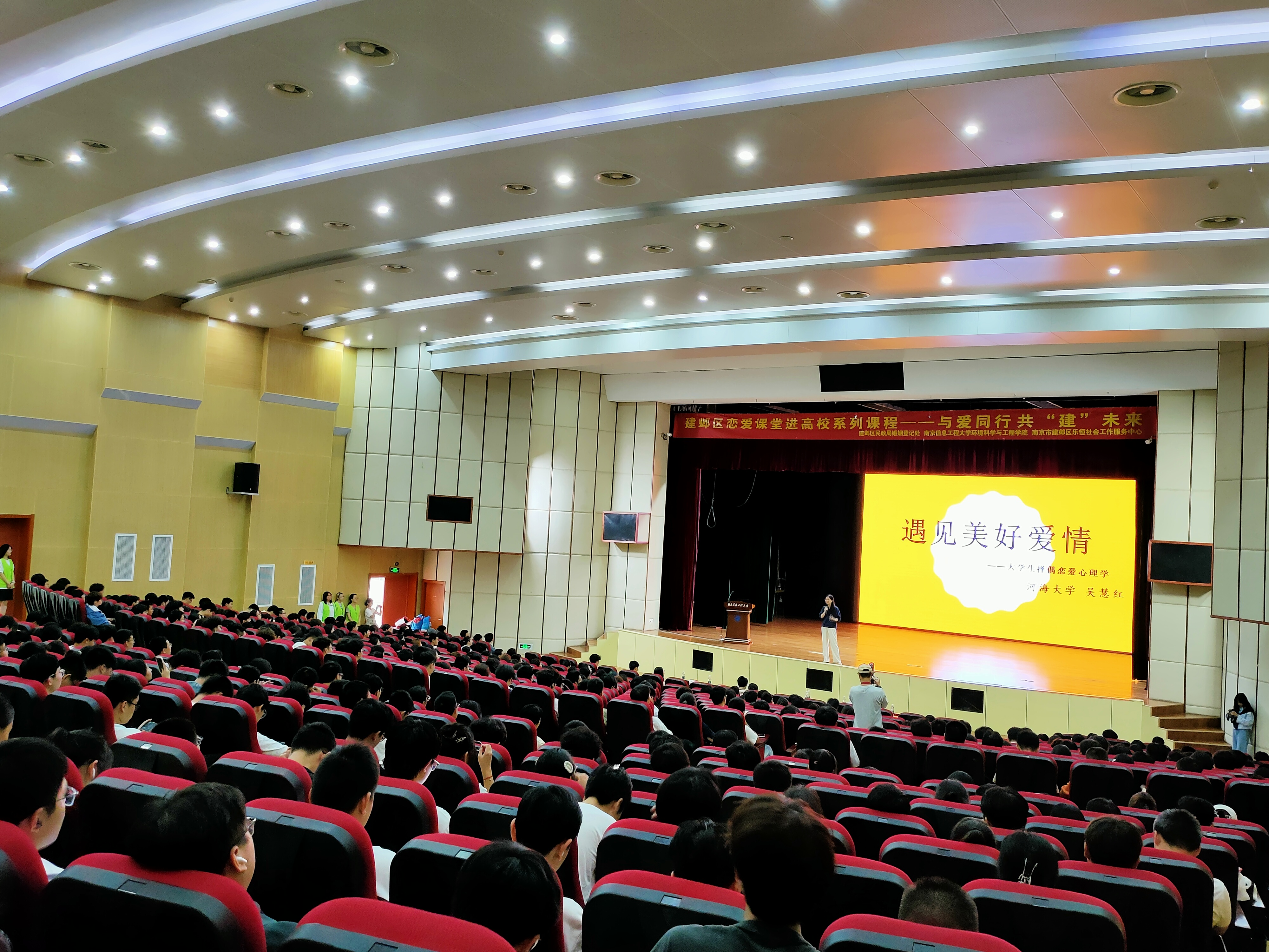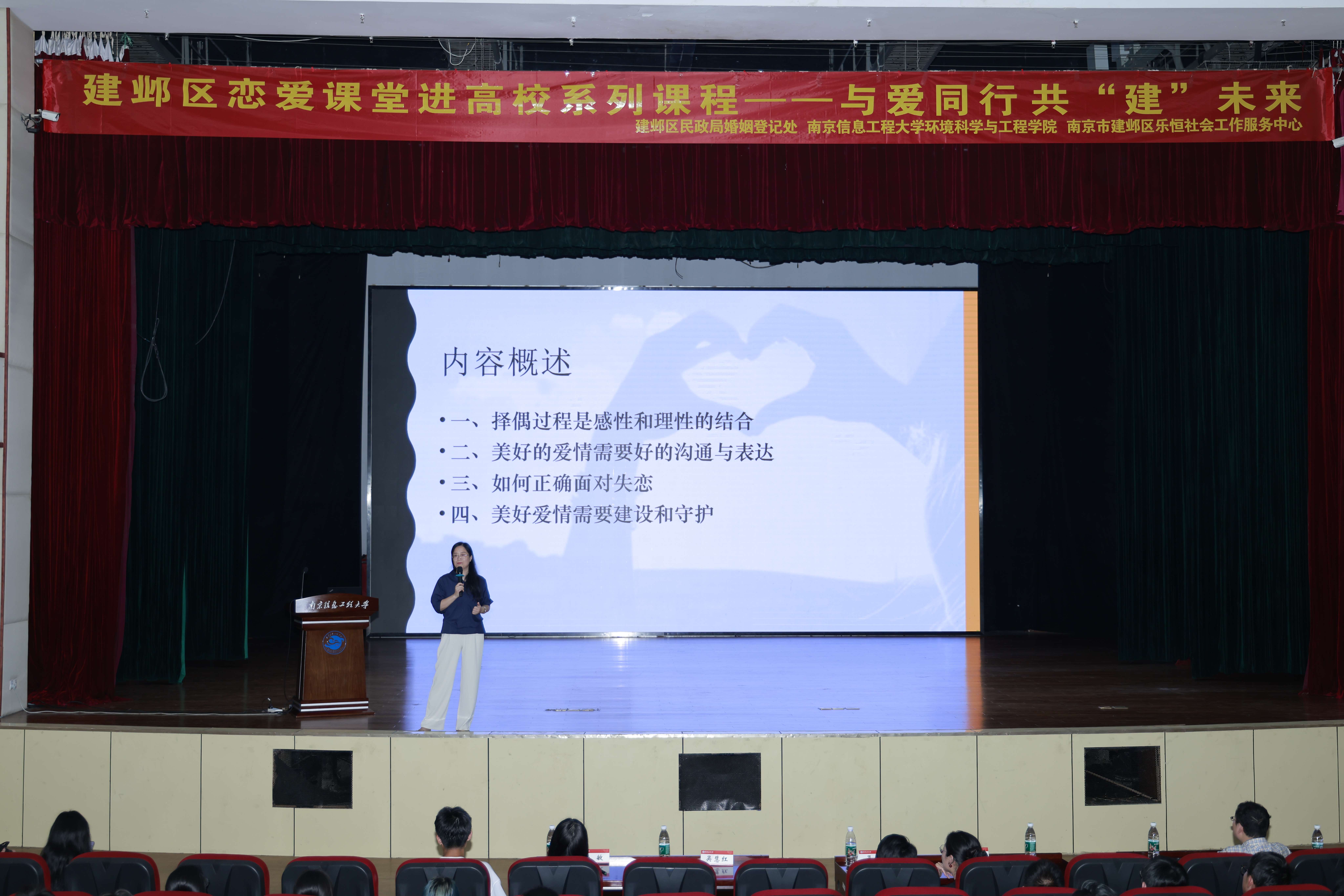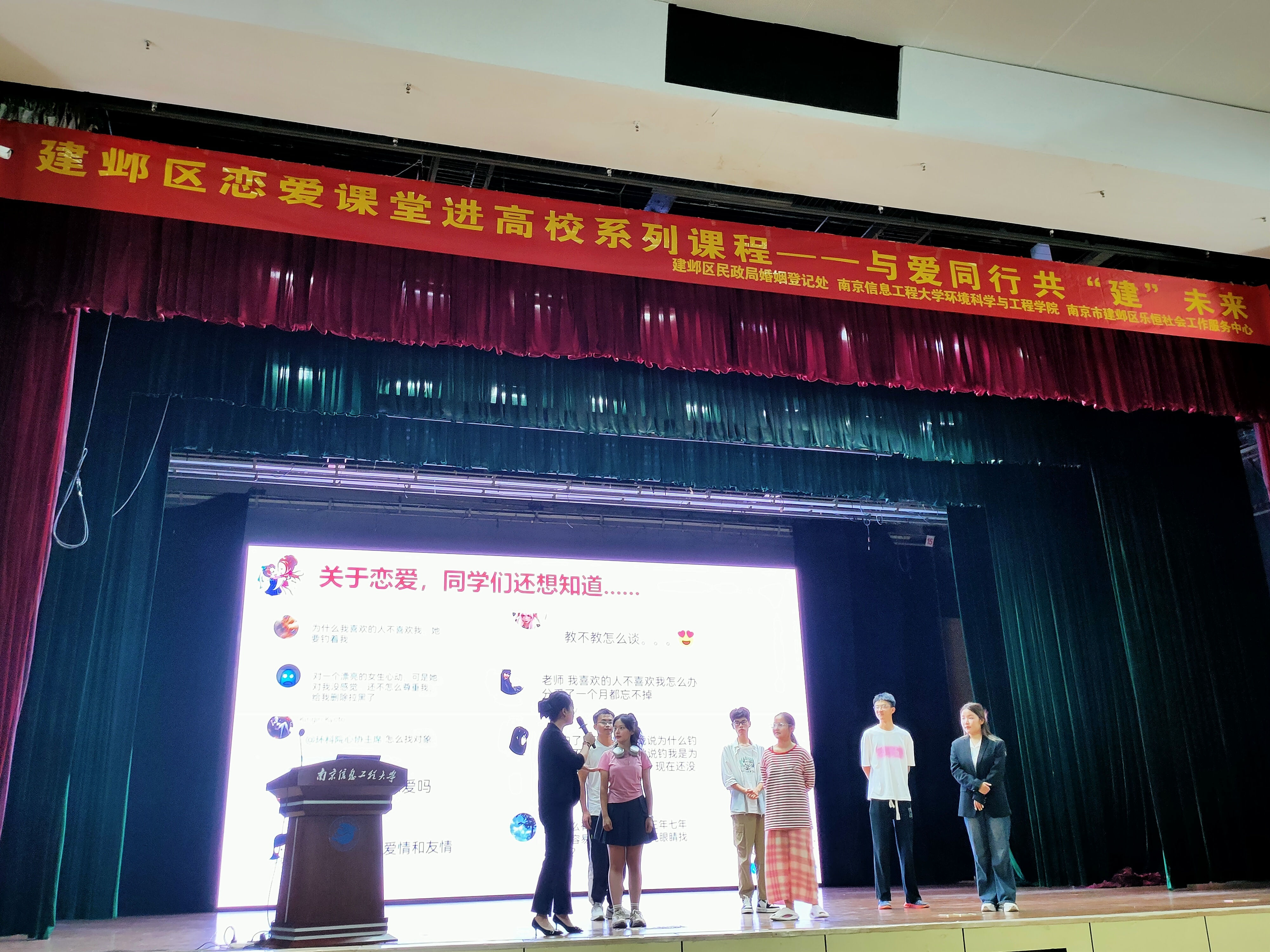 9月26日,一场由南京市建邺区民政局婚姻登记处主办,南京信息工程大学环境科学与工程学院、建邺区乐恒社会工作服务中心承办的主题为“与爱同行,共‘建’未来”的恋爱课堂走进南京信息工程大学,现场有近600名大学生报名参与了此次活动。