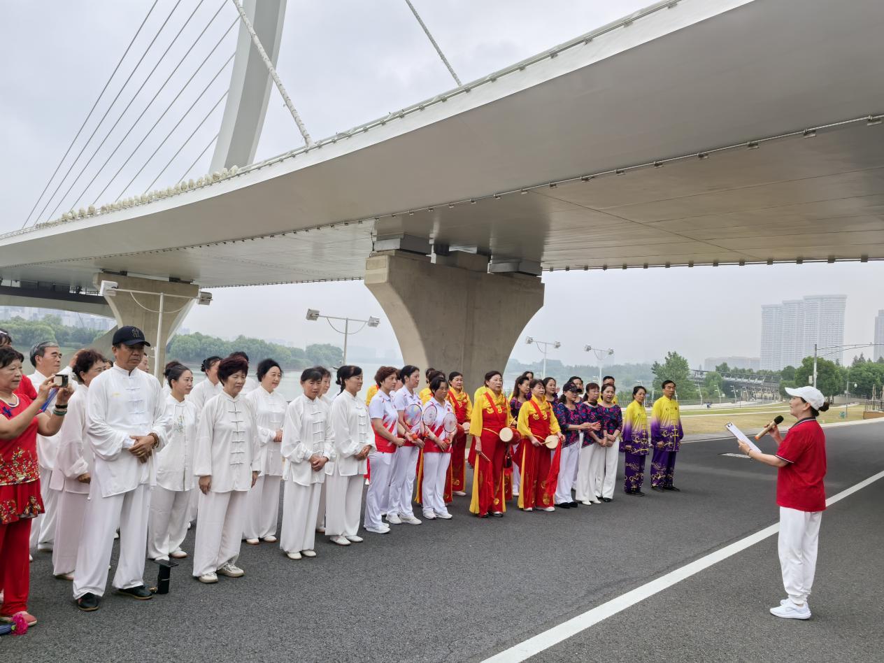 活动当天,来自全区的健步走爱好者们陆续汇集到南京国际青年文化公园的南京眼步行桥下。上午9点,全民健身展演节目拉开了健步走活动的序幕。在全民健身大联欢环节,市民们通过精彩的开场腰鼓、健身气功等节目,表达了对祖国的热爱和祝福,也展现了建邺区市民多才多艺、团结一心、积极乐观向上的精神风貌。