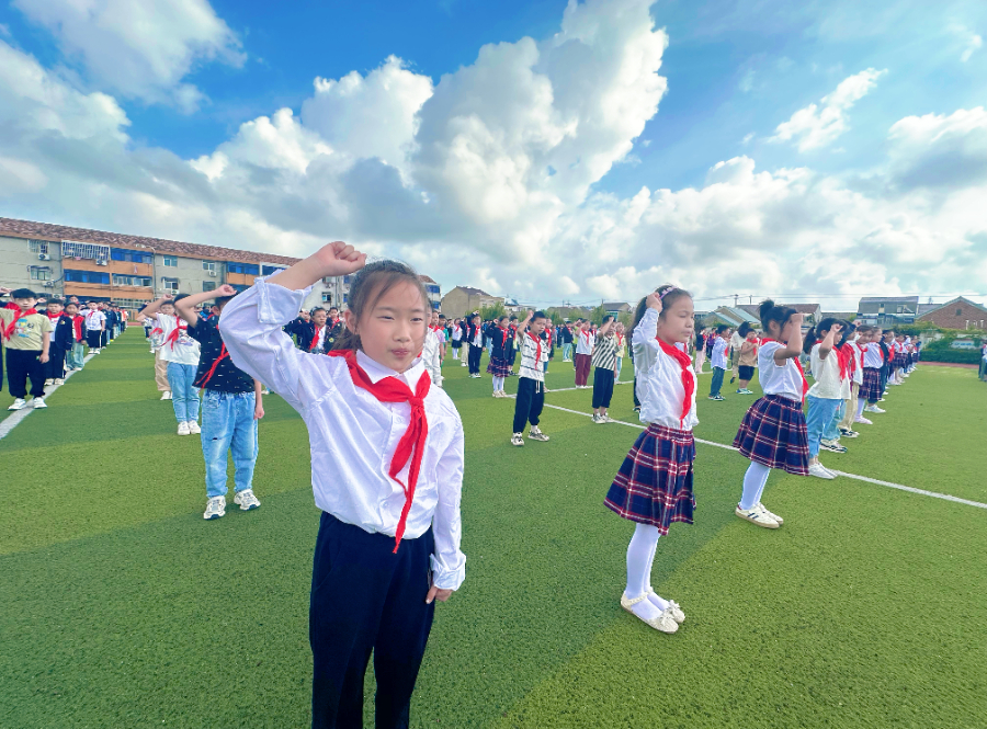 少先队员们胸前的红领巾随风飘扬,那是他们对祖国的赤诚之心。