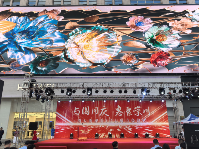 为推动文旅商融合高质量发展,大力培育经济新业态,丰富南大街的文化内涵和消费魅力,吸引消费者打卡注入“数字活力”,助力南通、崇川的现代服务业蓬勃发展,9月29日下午,南通崇川区举办“与国同庆·惠聚崇川”南大街裸眼3D大屏点亮仪式。