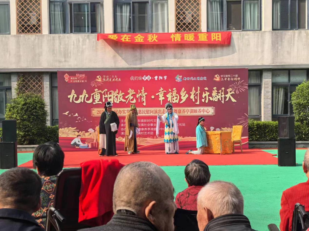“九九重阳敬老情 幸福乡村乐翻天”慰问演出在歌舞《祝福祖国》中拉开帷幕。淮剧《珍珠塔》中“赠塔”唱段,《白蛇传》中“断桥”一场,《牙痕记》中“金殿认子”选段,小品《事与愿违》,京剧《说唱脸谱》等10多个节目,都是老年人喜爱的节目,使老年观众很快就融入到了演出情境当中,现场不时爆发出阵阵掌声。