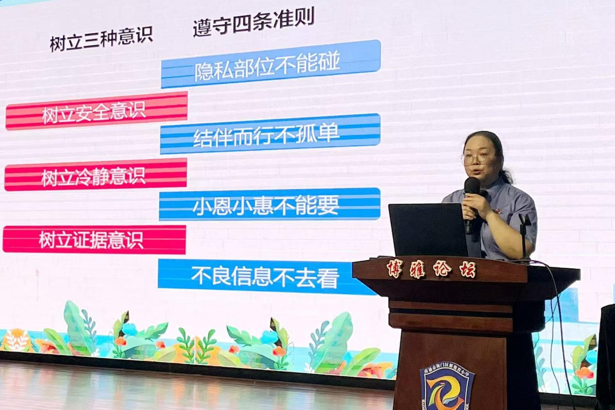 在海门区包场初级中学、区新教育小学,海门区检察院办公室主任张春燕、公益诉讼检察部副主任沈明红通过真实案例深入浅出地向同学们讲解什么是性侵害,如何辨别危险,如何远离危险,如何用法律保护自己。