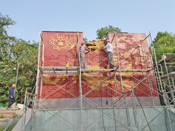 10月11日下午2点58分,在即将开园的丁蜀镇黄龙山矿址公园,一个巨大的紫砂龙头安装到位,标志着大型紫砂雕塑《黄龙献瑞》顺利落成。《黄龙献瑞》是黄龙山矿址公园的点睛之笔,这一作品长6.1米、高3.73米,正面为一条栩栩如生的黄龙,背面为《始陶异僧》图文,由88岁高龄的中国工艺美术大师徐秀棠历时3个多月领衔创作。