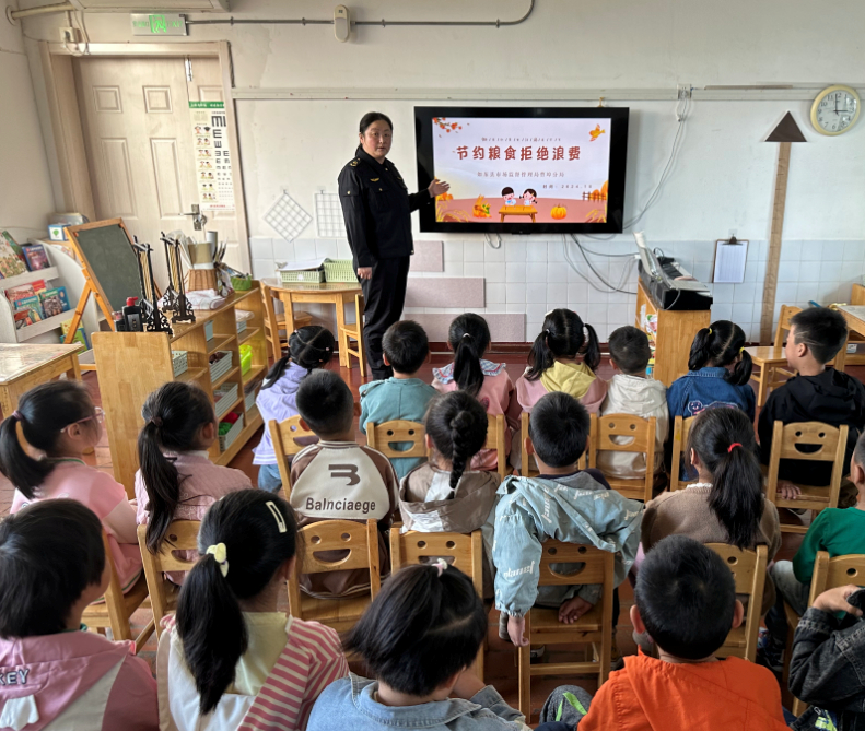 执法人员给幼儿园大班的小朋友们讲了一堂生动有趣的食品安全课,通过简单易懂的图片、视频和小故事,向小朋友们介绍了食品的分类、如何辨别食品的好坏以及节约粮食、反对浪费的重要性。采取互动问答的方式,让小朋友们明白了养成健康饮食习惯的重要性,要厉行节约、珍惜粮食,体会到了“粒粒皆辛苦”的涵义。小朋友们听得津津有味,积极参与互动,纷纷举手回答问题。