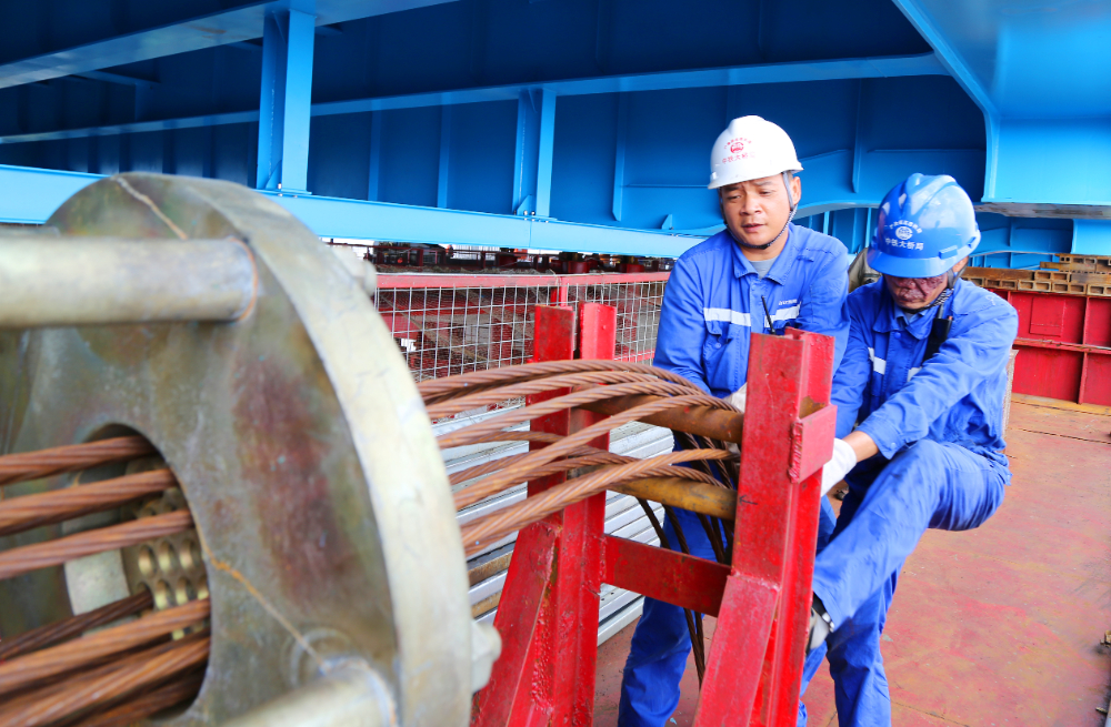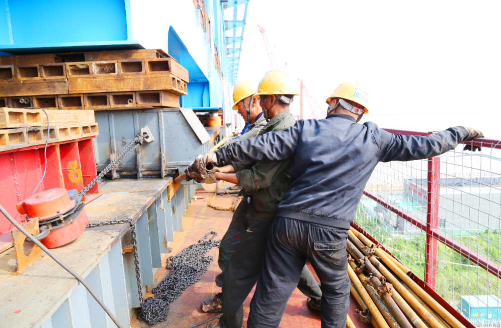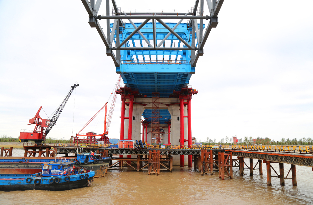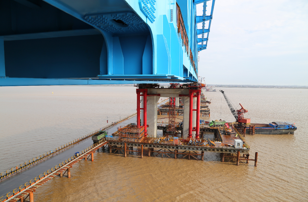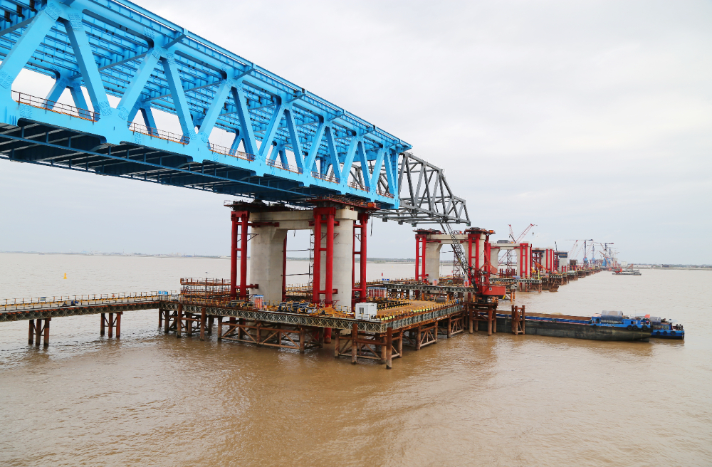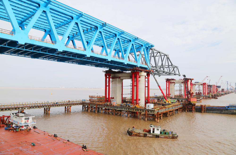 10月16日6时50分,经过72小时连续作业,由中铁大桥局承建的沪渝蓉高铁V标崇启公铁长江大桥非通航孔桥第四轮112米钢梁顶推顺利到位。目前,已完成56米、42米、112米、112米四次钢梁顶推任务,累计顶推钢梁322米,约8400吨。