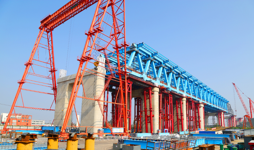 钢梁顶推系统由拼装支架、墩旁托架、顶推滑道、动力系统组成。本次投入5个墩的顶推设备,10台350吨水平顶,18台1600吨竖向顶,18台200吨横向纠偏顶,采取智能顶推,实时监控,自动纠偏,确保钢梁在顶推过程中的空间姿态及桥梁线型,同时保证施工过程中的安全。