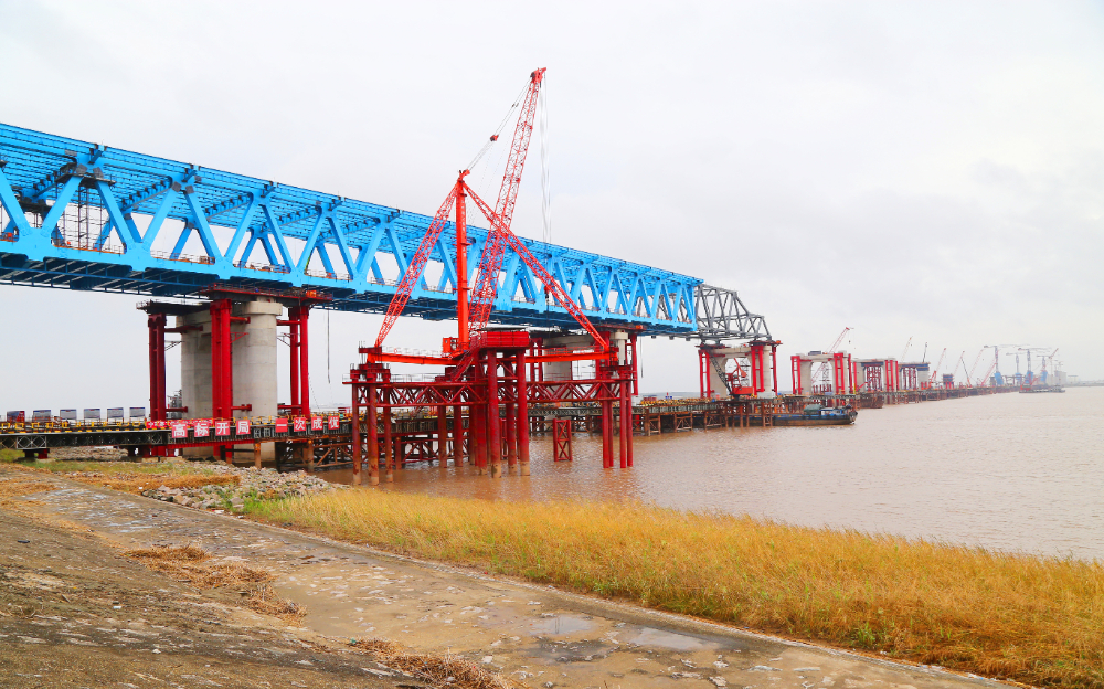 崇启公铁长江大桥是上海至南京至合肥高铁控制性节点工程,全长4.09公里,横跨长江入海口北支航道。其构造为双层布置的公铁两用桥,上层为双向6车道、时速100公里的一级公路,下层为时速350公里的双线高速铁路+时速250公里的双线城际铁路。其中主通航孔桥为主跨400米双塔双索面钢桁结合梁斜拉桥,是世界最大跨度双塔双索面公铁两用无砟轨道斜拉桥。