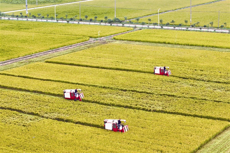 昨天下午,江阴市雪峰农业专业合作社,收割机正在田间作业。(丁家骏 摄)