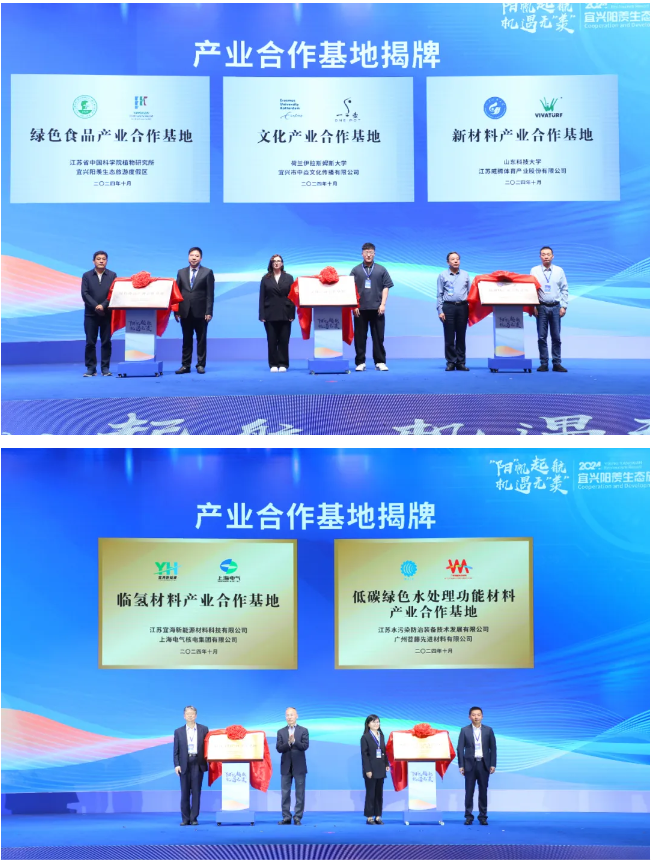 江苏省中国科学院林业研究院-宜兴阳羡生态旅游度假区绿色食品产业合作基地、山东科技大学-江苏威腾体育产业股份有限公司新材料产业合作基地、荷兰伊拉斯姆斯大学-宜兴市中焱文化传播有限公司文化产业合作基地、上海电气核电集团有限公司-江苏宜海新能源材料科技有限公司临氢材料产业合作基地、江苏水污染防治装备技术发展有限公司-广州苕藤先进材料有限公司低碳绿色水处理功能材料产业合作基地等5个产学研基地也举行了揭牌仪式。