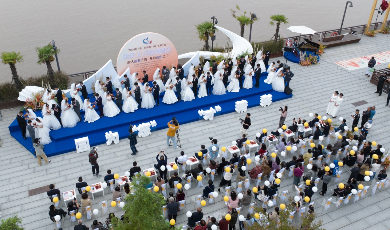 10月20日下午,青龙港1806景区,南通市海门区2024“缘•东洲愿”第三届青年人才集体婚礼浪漫开启。