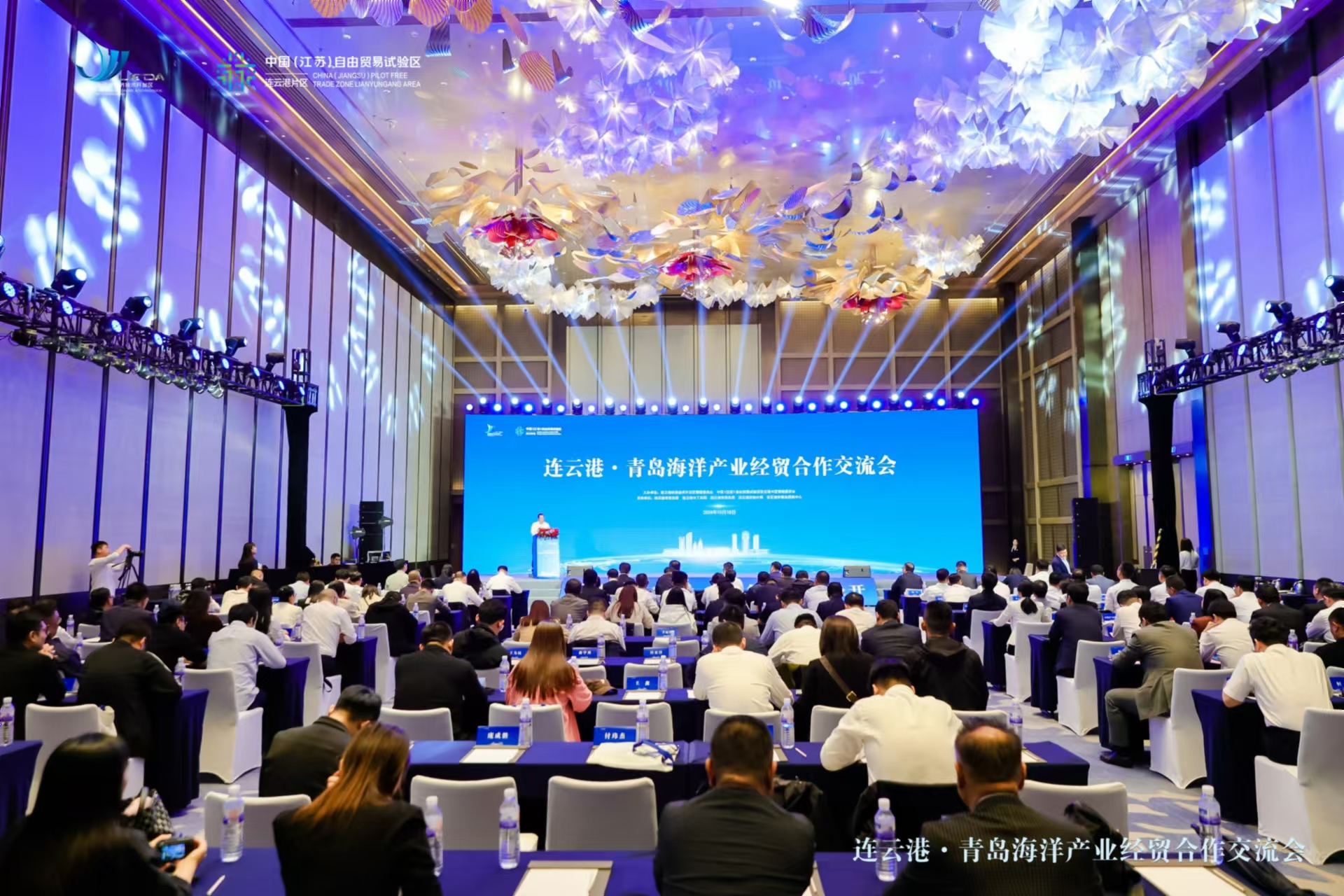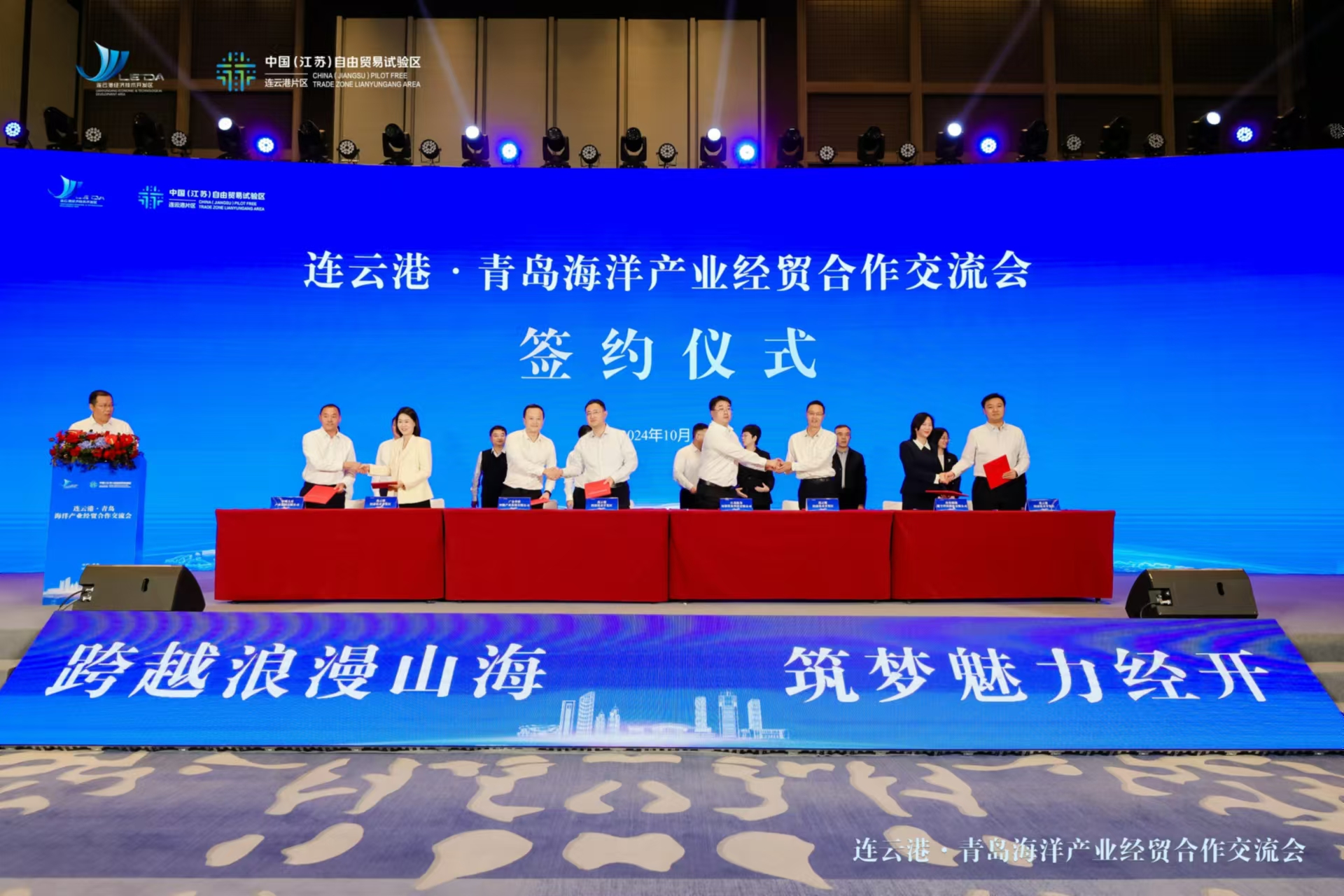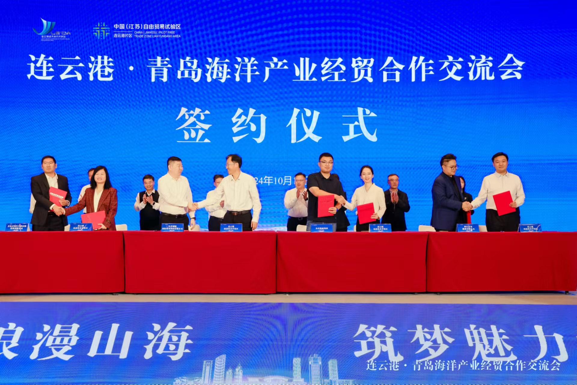 10月18日,连云港·青岛海洋产业经贸合作交流会在青岛成功举行。会议现场签约12个产业项目、总投资99亿元,4个大宗贸易项目,年贸易额114亿元;1个跨境电商项目,进出口额1亿美元;2个外贸项目,外贸额1亿美元,拼出来一份招商引资亮眼“成绩单”。连云港市委常委、连云港开发区党工委书记商振江,连云港市发改委主任李莉出席并致辞。连云港开发区党工委委员、管委会副主任曹波主持交流会。