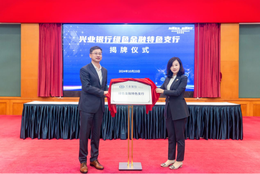 人民银行无锡市分行党委委员、副行长黄华,兴业银行无锡分行党委书记、行长孙涛共同为绿色金融特色支行揭牌