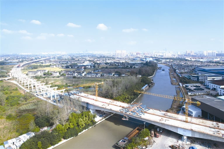 日前,江阴靖江长江隧道南接线工程JJSD-JY2标跨锡澄运河左幅挂篮悬浇中跨顺利完成合龙,标志着本项目最大跨径连续梁桥半幅主体结构贯通。图为昨天上午,从空中俯瞰正在加紧施工的江阴靖江长江隧道南接线工程。(丁家骏 摄)