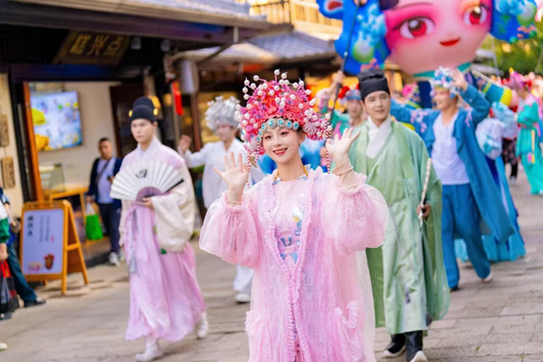 在香月花街上,巡游队伍欢声笑语不断,呈现出一幕幕别开生面的精彩表演,令人目不暇接。其中,超萌的“鹿樱樱”融合传统与国潮元素,带领游客载歌载舞,深切感受传统文化的独特魅力。而一出精彩的“川剧变脸”更是赢得了游客们的阵阵掌声与喝彩,这一绝技不仅是老一辈艺人们智慧与勇气的结晶,更是经过时间沉淀与磨砺的戏曲艺术瑰宝。拈花湾戏曲生活季通过让戏曲融入日常生活,成功地为这些古老技艺注入了新时代的活力,让它们在现代社会中焕发出别样的光彩。