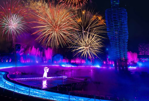 在今年国庆期间,拈花湾的微笑广场上更是热闹非凡。每晚,璀璨绚烂的烟花秀如约而至,不仅照亮了夜空,更点亮了每一个人心中对祖国的热爱和对美好生活的向往。数百架无人机腾空而起,在夜空中编织出一幅幅壮丽的画卷,时而排列成“我爱你中国”的深情告白,时而幻化成五星红旗迎风飘扬的壮丽景象。