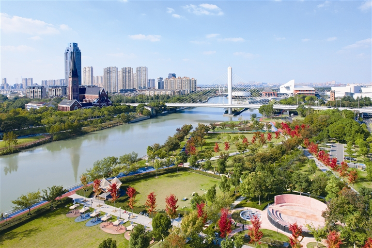 在晴好天气加持下,运河公园五彩斑斓的树叶与湛蓝天空相互映衬,美如画卷。近年来,我市高品质打造“八公里沿江、十公里运河”一江一河“城市T台”,形成美丽的生态岸线、市民的休闲岸线、游客的观光岸线,不断提升居民获得感和幸福感。(丁家骏 摄)