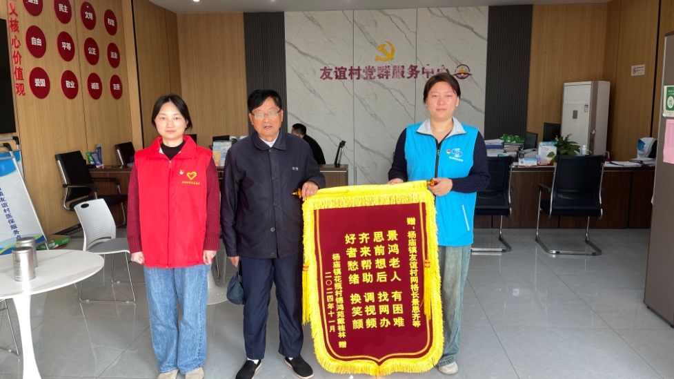 “真是太感谢你了,小景!这是我为你准备的锦旗,感谢你为我解决难题啊!”近日,扬州市邗江区杨庙镇友谊村锦鸿苑的一位老人握着网格员景思齐的手,将一面鲜红的锦旗递到了她的面前。回想起几天前的经历,老人仍感慨万千:“孩子给买了智能电视,可我咋都调不到台,询问多方都解决不了,真是急死我了!”