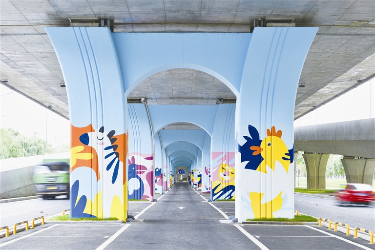 桥上车水马龙,桥下别有洞天。滨江快速路的高架桥下空间在“化身”便民停车场的同时,还依托艺术化改造提升了功能与品质。原本灰色的桥墩立柱被画上不同主题的彩绘,亮丽的色彩和图案装扮让桥下空间尽显艺术与活力气息。据悉,滨江路桥下空间停车场分布在沿线9个不同路段,施划480个停车泊位,目前已正式启动收费管理,并于近期实现“先离场后付费”智慧场景应用。(丁家骏 摄)