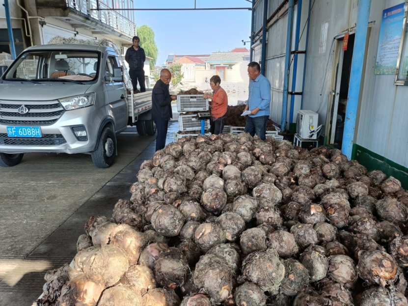 从地里挖出的芋头会迅速的运往当地的收购点,各村都分布着收购蔬菜合作社网点,垛田街道美华合作社收购现场,可以看到一辆辆满载芋头的三轮车和货车,收购点的工作人员忙碌地进行着称重、登记和装车工作。巧遇一对老夫妻是来自南通海安的蔬菜经销商,他们看了今年的芋头,非常满意,当场就订购了3000斤芋头。美华龙香芋合作社就这样,带领着当地的农民,一年又一年的精心种植着龙香芋,一堆堆圆滚滚的芋头堆成了小山,运往全国各地的市场,美华合作社为更好拓展芋头销售市场,进行冷冻初加工,每年能加工销售量两成以上,延长销售周期,走进千家万户的餐桌。