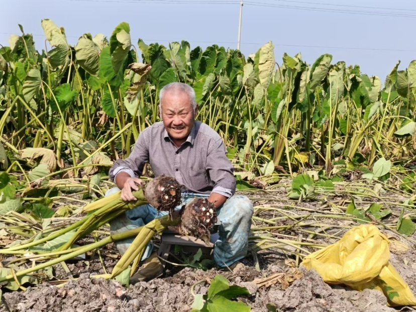 走进芋头种植地,满眼都是郁郁葱葱的芋叶,犹如一把把绿色的大伞,在微风中轻轻摇曳。垛田街道王横村十八组的王葛善老农正蹲在地里,双手捧着刚挖出的芋头,脸上洋溢着满足的笑容。今年王葛善的芋头不仅个头大、分量足,而且没有遭到一点病虫害,看着满箩筐的芋头,他开心地说道:“今年的芋头长得特别好,产量比去年高了不少,口感好!”