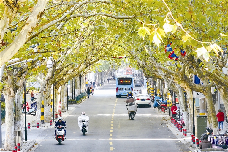 初冬的序曲轻启,大街小巷的梧桐树悄然披上了金黄的华服,为降温的江阴城带来了一抹别样的“温暖”。图为昨天下午,阳光透过稀疏的叶缝洒向南街的柏油路,行人与车辆在梧桐树下缓缓穿行,宛如一幅油画。(丁家骏 摄)