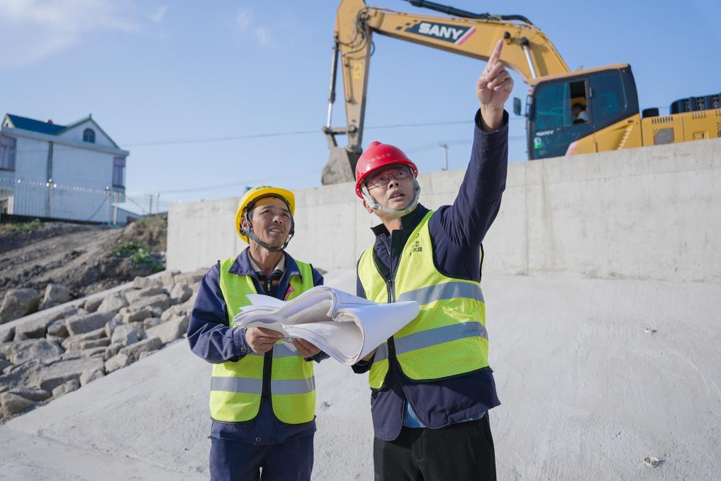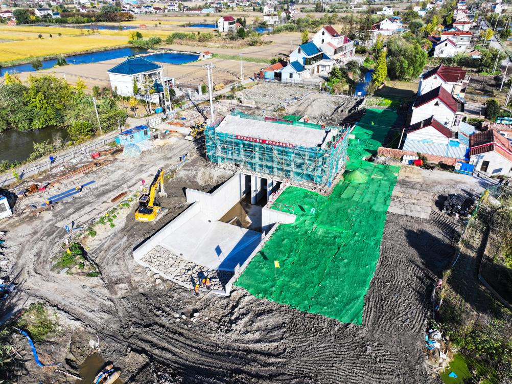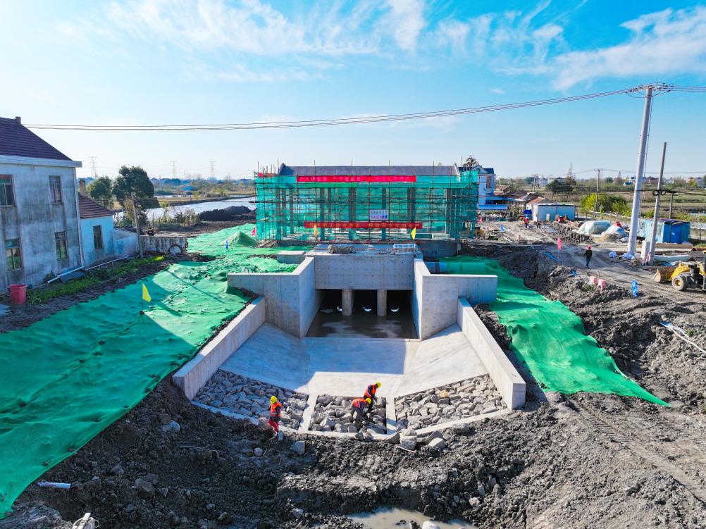 11月26日,工人在江苏省如东县农村河道综合治理水系贯通项目施工二标段曹埠镇直港三河泵站施工现场施工作业。