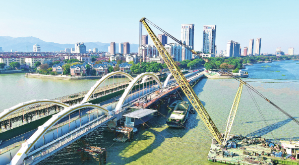 眼下,世纪大桥改造提升工程建设已进入冲刺阶段,在北侧人非桥全线贯通后,南侧人非桥预计于2025年1月中旬实现全线贯通。届时,世纪大桥将全面转入路面施工阶段,预计2025年春节前恢复正常通行。图为吊装现场。