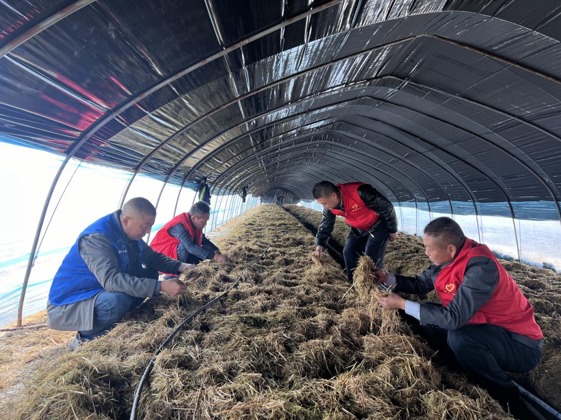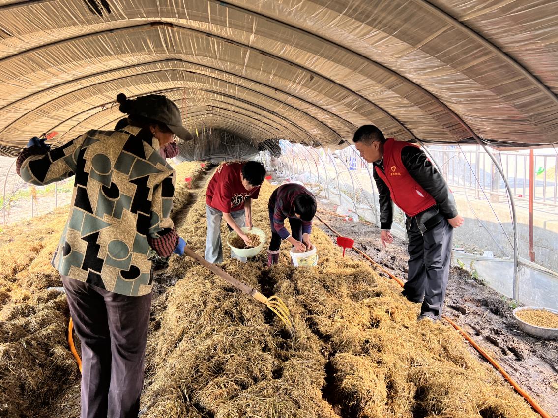 在二塘社区食用菌种植大棚,工人们正在将赤松茸菌棒掰成鸡蛋大小的菌种块,以15厘米的间隔点播在菌床上,再覆盖一层约13厘米厚的基料,为菌种盖好“保暖被”,这样就可以静静等待出菇了。