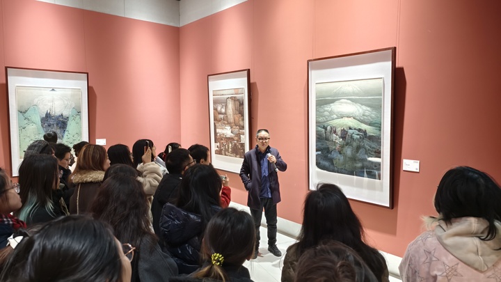 12月14日,薛亮现身江苏省现代美术馆1号展厅,向观众解读其作品创作经历和表达的情感。