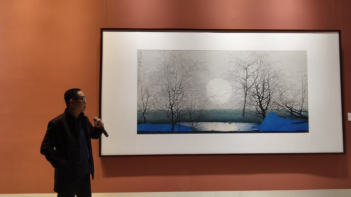 “大家看这幅画的时候一定会被一种幽静感所打动。”沿着薛亮手指方向,大家目光聚焦于画作《薄暮月初升》上,整幅画以石头、水塘、树、月亮为基本元素,传达一种幽静、神秘的意境。薛亮说:“在幽静中还有很多生命的存在,树上无数嬉戏的小鸟,加深了幽静之气,让画充满了生命的力量。”
