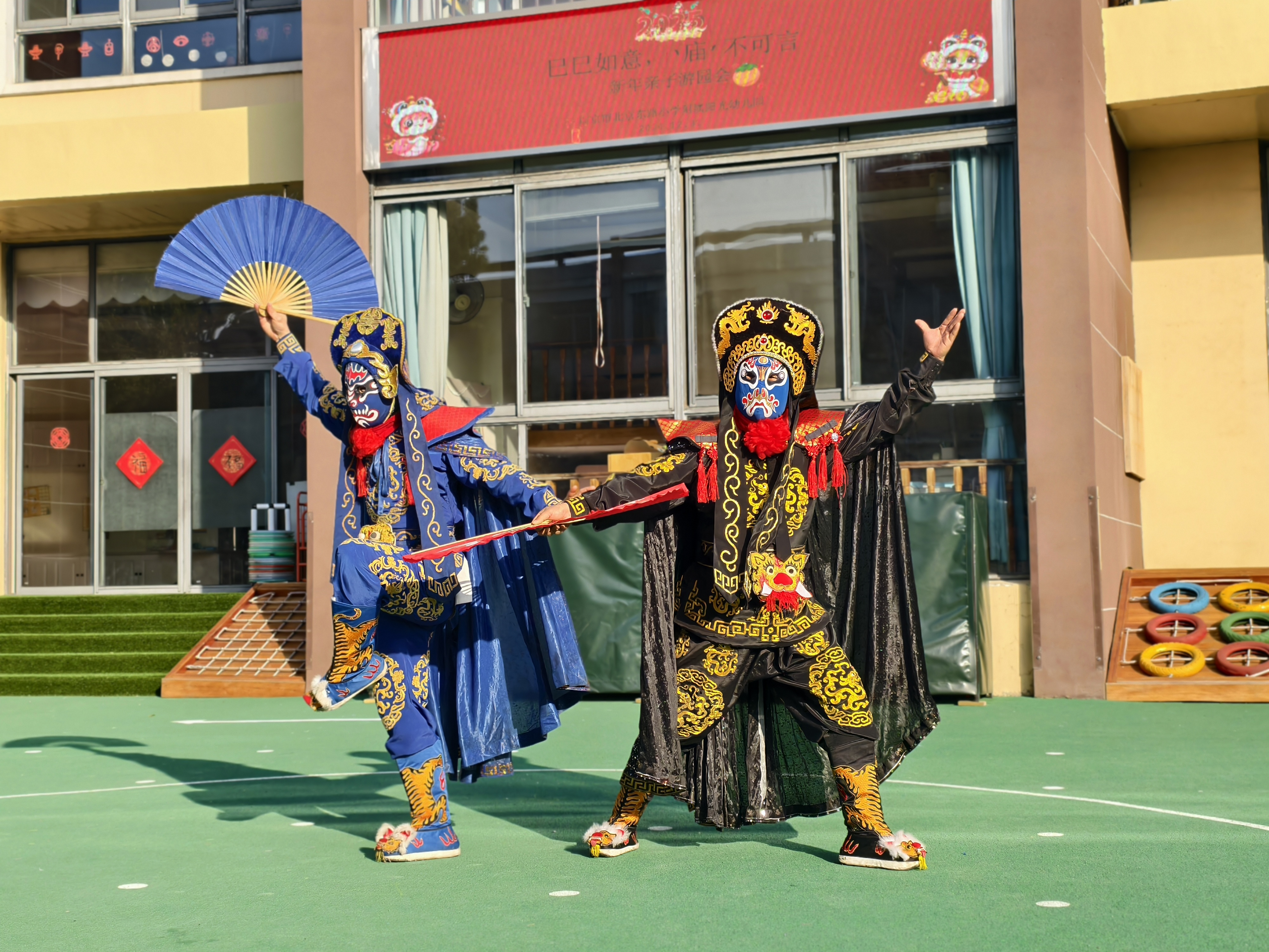 清晨,孩子们身着喜庆的红色服饰,以热情洋溢的笑容踏入幼儿园。孩子和家长们纷纷与园内的新年装饰合影留念,展现对新年的美好期待与祝福。“巳巳如意 庙不可言”迎新年亲子游园活动分为非遗文艺表演、亲子游戏和民俗小吃品尝三个活动。随着大班幼儿舞龙队的登场,非物质文化遗产文艺表演正式拉开帷幕。腰鼓、顶缸、变脸、抖嗡、长扇等非遗项目轮番上演,将惊险、奇妙、美丽展现得淋漓尽致,为大家献上了一场精彩绝伦的视觉盛宴。