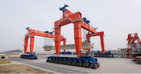 随着我国高铁技术的迅速发展,为匹配大型及超长跨海桥梁建设需求,铁路箱梁的设计跨径已扩展至60米及更大尺寸。为有效解决“巨无霸”箱梁的搬运难题,靖江重工公司聚合研发力量,推进关键核心技术攻关,耗时6个月成功研制出两台“沧龙号”1250吨轮胎式搬梁机。