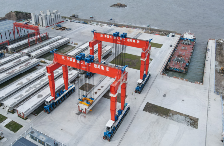 上午,在宁波象山预制梁场,两台“沧龙号”搬梁机通过配合联动,将重达1700吨的预制箱梁吊装下放至运输船。随着运输船驶出港口,这榀箱梁将用于跨海大桥桥面架设。“‘沧龙号’起重量是1250吨。”中铁建大桥工程局集团靖江重工有限公司搬梁机技术负责人张洪涛介绍,两台“沧龙号”自重约830吨,跨距达44.6米,净起升高度达23米,配有88只充气巨型轮胎,2台联吊起重能力达2500吨,重载最大走行速度达每分钟17米。