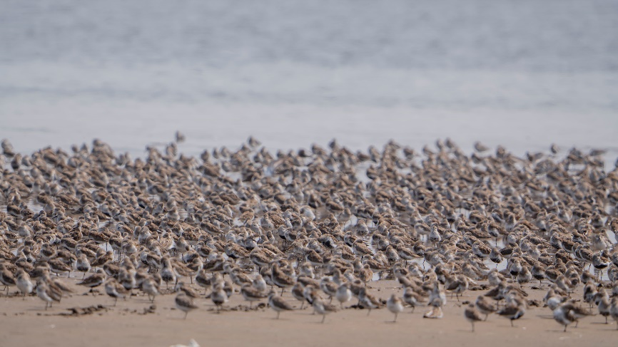 作为长江、黄海、渤海三水交汇之地,启东的沿海湿地和滩涂一直是“东亚-澳大利西亚”鸟类迁徙路线中重要的“补给站”。每年都会有数以千计的黑腹滨鹬、环颈鸻“大军”如约而至,在长江口北支湿地集中停歇捕食,今年也格外热闹。