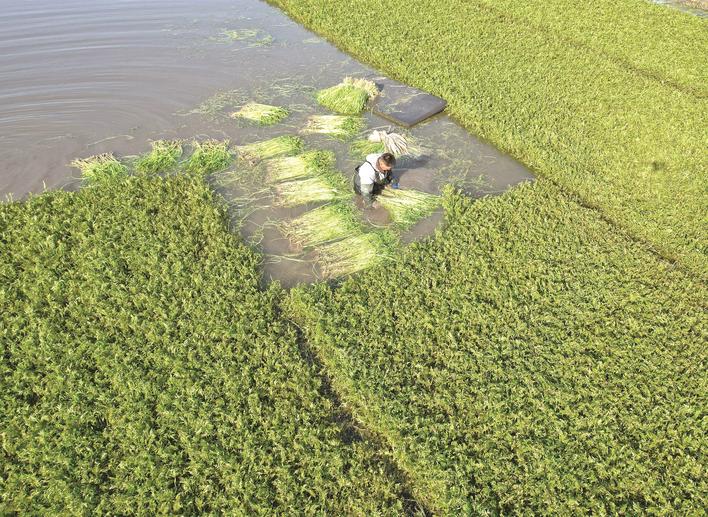 昨天,海安墩头镇长垎村,村民正在水田里采收水芹菜,供应节日市场。近年来,墩头镇大力发展生态水芹种植,通过优化品种结构和种植模式,实现全年多季采收,在增加种植户经济收入的同时,带动村民家门口就业。(周强)