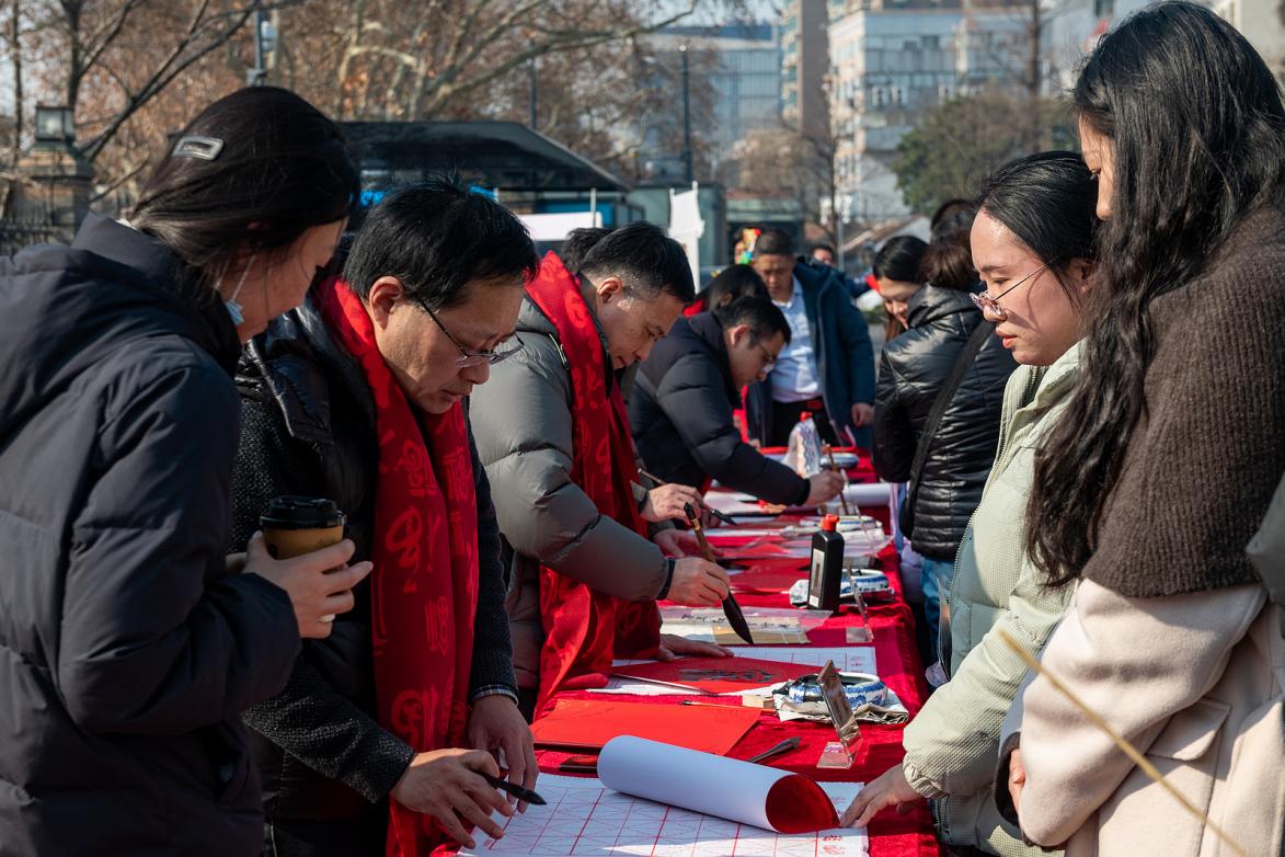 活动现场,每个人脸上都洋溢着兴奋与期待,跟随专业的书法老师、崇川区春联书法大赛获奖小朋友、非遗传承人、文明实践志愿者,参与汉服体验、剪纸、写福字、糖画、仿真绣等丰富多彩的项目。书法爱好者们挥毫泼墨,写下美好的祝愿,为大家送上新年祝福;外国留学生身穿汉服拍照打卡,拿起毛笔“写福送福”,感受花式剪纸的魅力;市民、游客积极互动,亲切主动地向外国友人介绍民俗体验项目的玩法,孩子们迷上了投壶、丢沙包,现场掌声、欢呼声、叫好声此起彼伏,大家共同分享喜悦,增进了彼此的友谊。