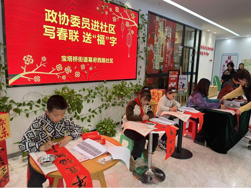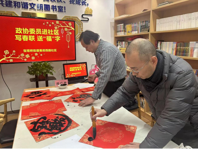 新春将至,年味渐浓。近日,南京市鼓楼区宝塔桥街道在幕府西路社区开展“送福送春联一起过大年”社区活动。此次活动邀请区政协委员、著名书法家周广中、徐世通,党员志愿者、居民群众及小朋友们共同参与。活动分为书法家组和小朋友组。两个活动小组为居民送上近百幅“福”字和春联后,书法家们还为热爱书法的小朋友提供了书法指导。