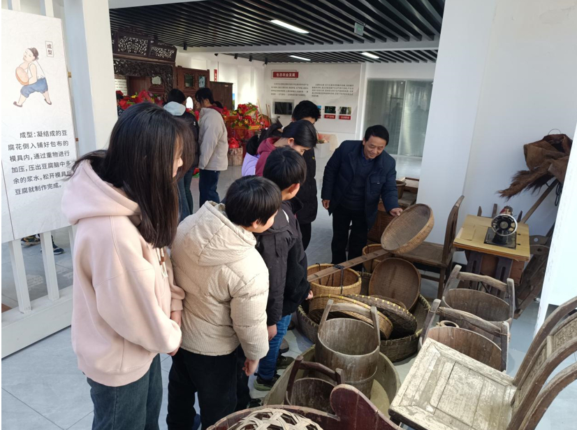 小朋友在志愿者带领下,走进蒋堡村科普劳动实践基地,近距离感受家乡历史文化,了解家乡发展变化。一踏入展览馆,琳琅满目的老物件便映入眼帘。在参观过程中,志愿者不仅为孩子们详细讲解了每件展品的历史背景和文化内涵,还结合地域特色和民俗文化讲述了这些老物件背后的故事。在孩子们幼小的心灵中播下了热爱家乡、传承文化的种子。