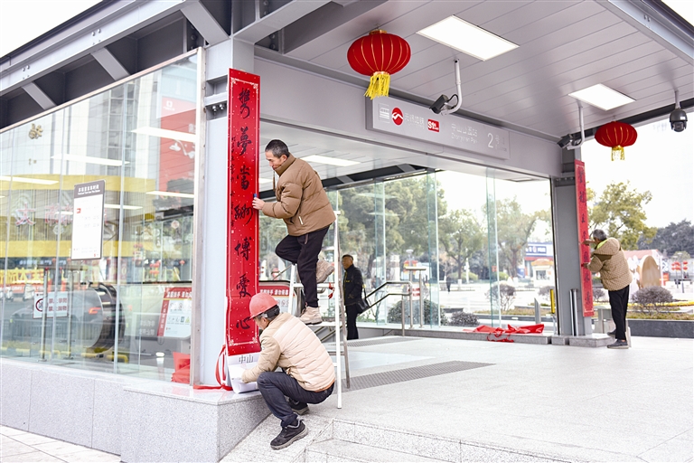 在沪宁沿江高铁江阴站、S1线沿线站点,中国结、福字、春联等春节元素也随处可见。“我是从外地出差来到江阴的,感觉江阴站很漂亮,进出口的大门上都贴了春联,真是年味十足。”旅客王璐敏说,一进站,他就感受到了江阴这座城市的热情好客。(顾莹 徐丽莉)