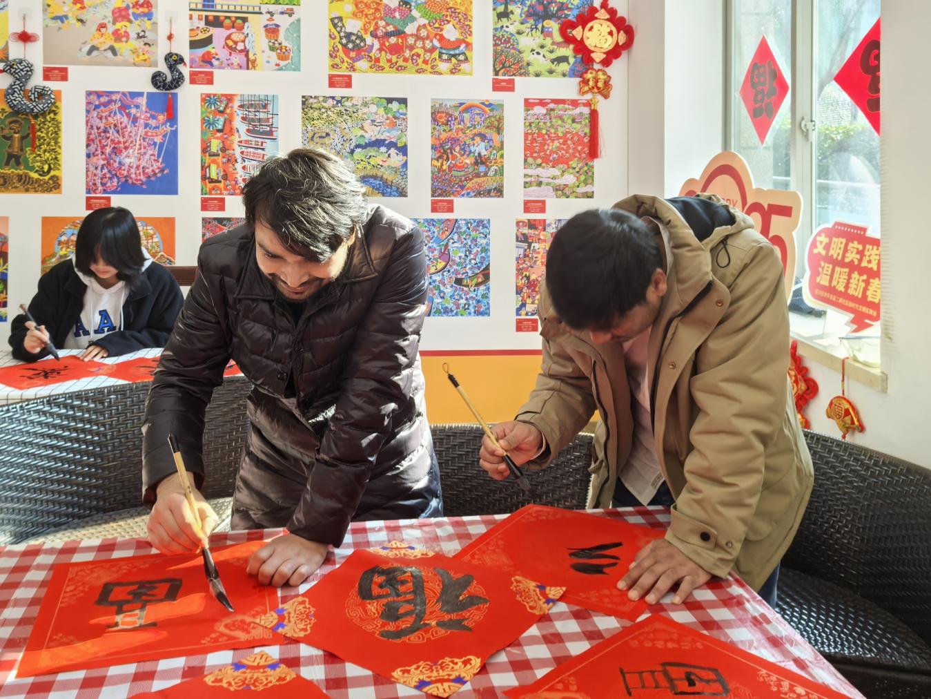 活动开场,南通大学纺织服装学院党委书记刘其霞发表致辞,希望同学们领略传统手工艺魅力,增强文化自信。随后,学子们拿起毛笔,饱蘸浓墨,在书法爱好者的指导下写福字。从握笔姿势、用墨技巧到起笔收笔,志愿者们耐心指导,大家悉心学习,气氛温馨热烈。笔锋游走间,一个个“福”字跃然纸上,为活动增添了几分喜庆的文化气息。外国留学生们也大胆创作临摹福字,一笔一划虽稚嫩,但饱含新意与诚意。