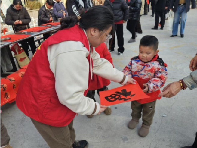 活动现场,永丰镇的社工们身着统一的服装,面带微笑,热情地接待每一位前来领取春联的村民。他们不仅协助书法爱好者们铺纸研墨,还主动承担起维护现场秩序、引导村民有序领取春联的任务。在忙碌的身影中,社工们始终保持着耐心和细致,确保每一位村民都能满载而归。