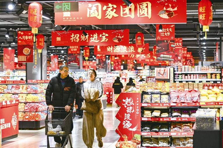 为推动春节消费活动,1月22日起江阴启动派发总额1000万元的惠民消费券,涵盖汽车、百货、住宿餐饮、超市四大类,聚焦市民生活需要及年货采购需求。图为昨天下午,市民们在吉麦隆超市选购心仪年货,为新一年添置新物,感受新年氛围。(张予希)